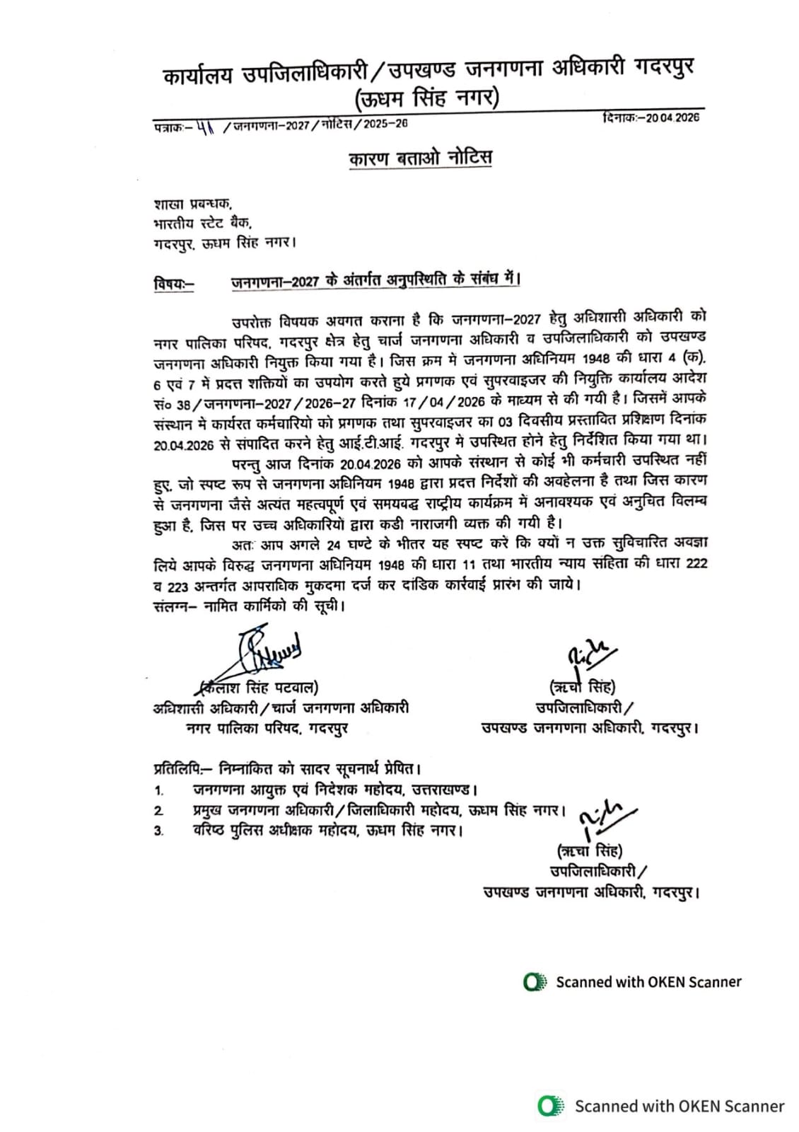 अतः आप अगले 24 घण्टे के भीतर यह स्पष्ट करें कि क्यों न उक्त सुविचारित अवज्ञा लिये आपके विरुद्ध जनगणना अधिनियम 1948 की धारा 11 तथा भारतीय न्याय संहिता की धारा 222 व 223 अन्तर्गत आपराधिक मुकदमा दर्ज कर दांडिक कार्रवाई प्रारंभ की जाये।
