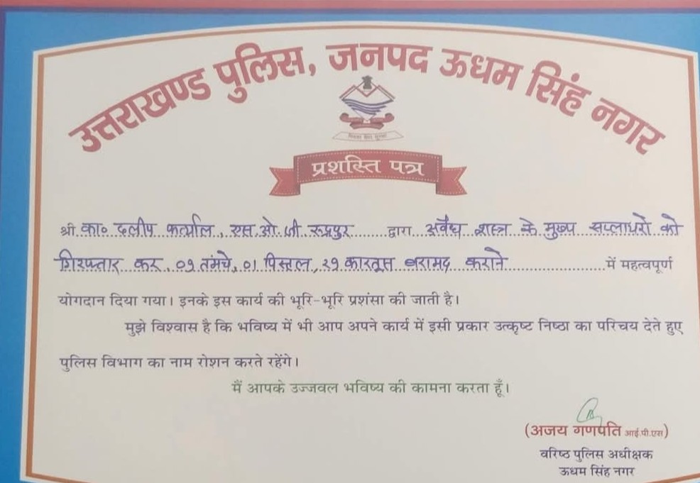 रुद्रपुर, संवाद सूत्र।जनपद ऊधम सिंह नगर में अवैध शस्त्र तस्करी के खिलाफ चलाए जा रहे अभियान के तहत सराहनीय कार्य करने पर एसओजी रुद्रपुर में तैनात सिपाही दलीप कत्र्याल को सम्मानित किया गया है।