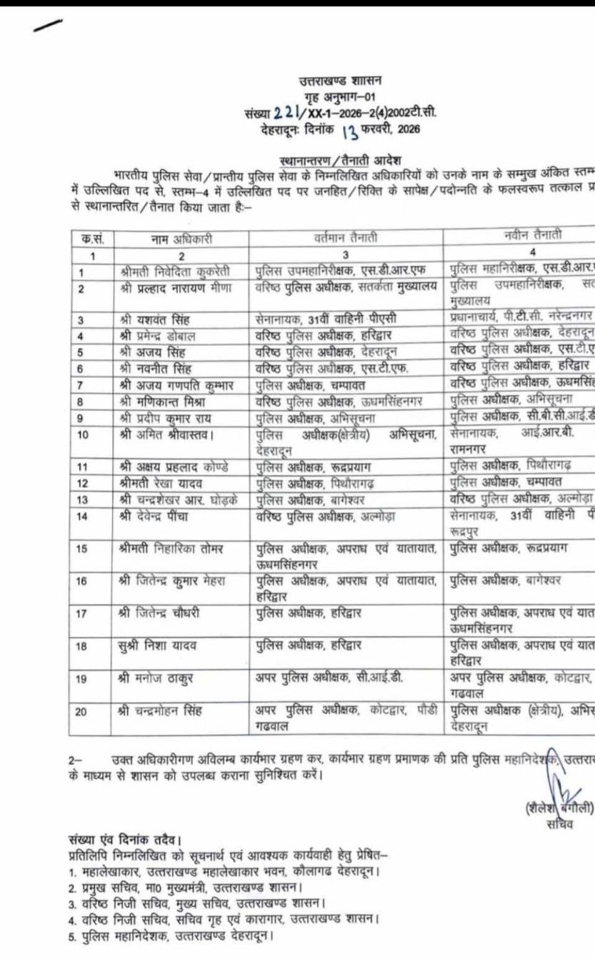 गदरपुर (संवाद सूत्र )राज्य में कानून व्यवस्था को और सुदृढ़ बनाने के उद्देश्य से पुलिस महकमे में बड़ा प्रशासनिक फेरबदल किया गया है। शासन स्तर से जारी आदेश के अनुसार सात जिलों के पुलिस कप्तानों (एसपी) का तबादला कर दिया गया है। इस व्यापक बदलाव को पुलिस महकमे में “बड़ी सर्जरी” के रूप में देखा जा रहा है।
