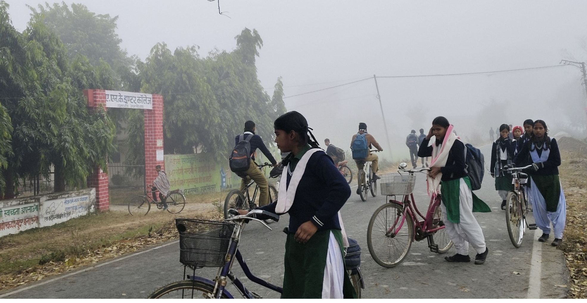 शीत लहर का प्रकोप जारी घने कोहरे के बीच स्कूल कॉलेज जाते बच्चे