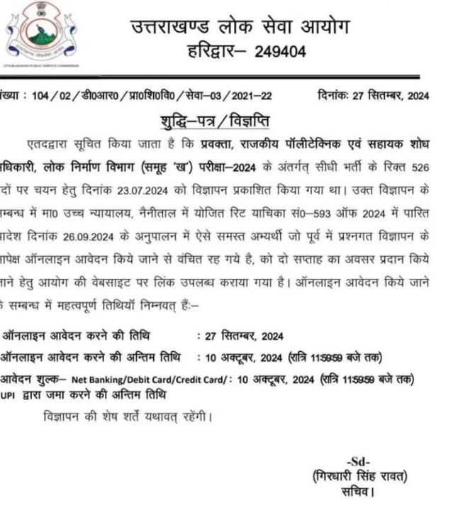 एतदद्वारा सूचित किया जाता है कि प्रवक्ता, राजकीय पॉलीटेक्निक एवं सहायक शोध अधिकारी, लोक निर्माण विभाग (समूह ‘ख’) परीक्षा-2024 के अंतर्गत् सीधी भर्ती के रिक्त 526 पदों पर चयन हेतु दिनांक 23.07.2024 को विज्ञापन प्रकाशित किया गया था। उक्त विज्ञापन के सम्बन्ध में मा० उच्च न्यायालय, नैनीताल में योजित रिट याचिका सं0-593 ऑफ 2024 में पारित आदेश दिनांक 26.09.2024 के अनुपालन में ऐसे समस्त अभ्यर्थी जो पूर्व में प्रश्नगत विज्ञापन के सापेक्ष ऑनलाइन आवेदन किये जाने से वंचित रह गये है, को दो सप्ताह का अवसर प्रदान किये जाने हेतु आयोग की वेबसाइट पर लिंक उपलब्ध कराया गया है। ऑनलाइन आवेदन किये जाने के सम्बन्ध में महत्वपूर्ण तिथियाँ निम्नवत् हैं:-