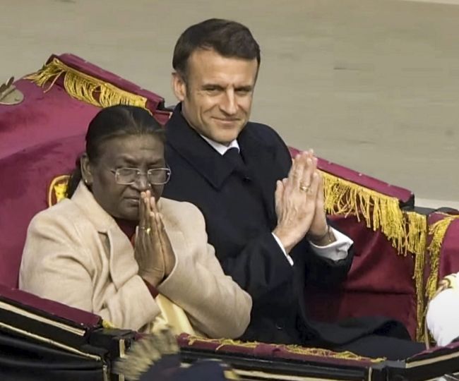 प्रधानमंत्री नरेन्द्र मोदी ने राष्ट्रपति द्रौपदी मुर्मु और व उनके फ्रांसीसी समकक्ष इमैनुएल मैक्रों की आगवानी की। राष्ट्रपति मुर्मु व मुख्य अतिथि पारंपरिक बग्गी से कर्तव्य पथ पर पहुंचे, जहां पर उन्होंने जनता का अभिवादन स्वीकार किया। इस दौरान पीएम मोदी ने मैक्रों को गले लगाया और कुछ देर दोनों को बात करते हुए भी देखा गया।