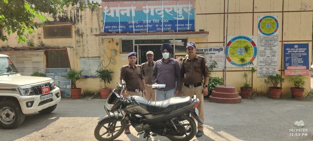 गदरपुर श्रीमान वरिष्ठ पुलिस अधीक्षक महोदय, जनपद उधम सिह नगर द्वारा जनपद मे मादक/ नशीले पदार्थो की तस्करी करने वालो के विरूद्ध प्रभावी कार्यवाही करने के निर्देशो के क्रम मे, श्रीमान पुलिस अधीक्षक महोदय काशीपुर एवं पुलिस अधीक्षक महोदय अपराध रूद्रपुर, श्रीमान क्षेत्राधिकारी महोदय बाजपुर के निकट पर्यवेक्षण मे प्रभारी निरीक्षक गदरपुर के नेतृत्व मे थाना गदरपुर पुलिस टीम व एस0टी0एफ0 कुमाँऊ यूनिट की संयुक्त कार्यवाही में दिनांक 28/10/2025 को समय 21.20 बजे नवाबगंज रोड अलखेदवी तिराहे के पास वाहन चैकिंग के दौरान एक संदिग्ध व्यक्ति भवदीप सिंह पुत्र मलकीत सिंह निवासी मकान नम्बर-160 नवाबगंज थाना बिलासपुर जनपद रामपुर उत्तर प्रदेश उम्र 19 वर्ष जो मो0सा0 हीरो सुपर स्प्लेंडर मे सवार होकर नवाबगंज की तरफ से आ रहा था जिसको चैक किया गया तो इसके पास से दो पीले रंग की प्लास्टिक की पारदर्शी पन्नी मे कुल 01.902 किलोग्राम शुद्ध अफीम मय पन्नी सहित वजन 01.920 किलोग्राम अवैध अफीम बरामद की गयी। पकडे गये व्यक्ति से बरामद अवैध अफीम के संबन्ध मे सख्ती से पूछताछ की गयी तो उक्त अवैध अफीम पारस अरोरा पुत्र बन्टी निवासी ग्राम नबाब गंज गुरुद्वारे के पास थाना विलासपुर जिला रामपुर उ0प्रदेश से लेकर आने व गदरपुर मे 2000 रुपये तोला के हिसाब सें नशा करने वालो को बेचने की बात कही गयी। अभियुक्त को उसके जुर्म धारा 8/18/60 एनडीपीएस एक्ट से अवगत कराते हुए हिरासत पुलिस लेकर गिरफ्तार किया गया है। बरामदगी के आधार पर गिरफ्तार अभियुक्त भवदीप सिंह के विरूद्ध थाना गदरपुर पर FIR NO 283/2025 U/S 8/18/60 NDPS ACT का अभियोग पंजीकृत किया गया है । पकडे गये उपरोक्त अभियुक्त के विरूद्ध अग्रिम आवश्यक वैधानिक कार्यवाही कर माननीय न्यायालय के समक्ष पेश किया जा रहा है।