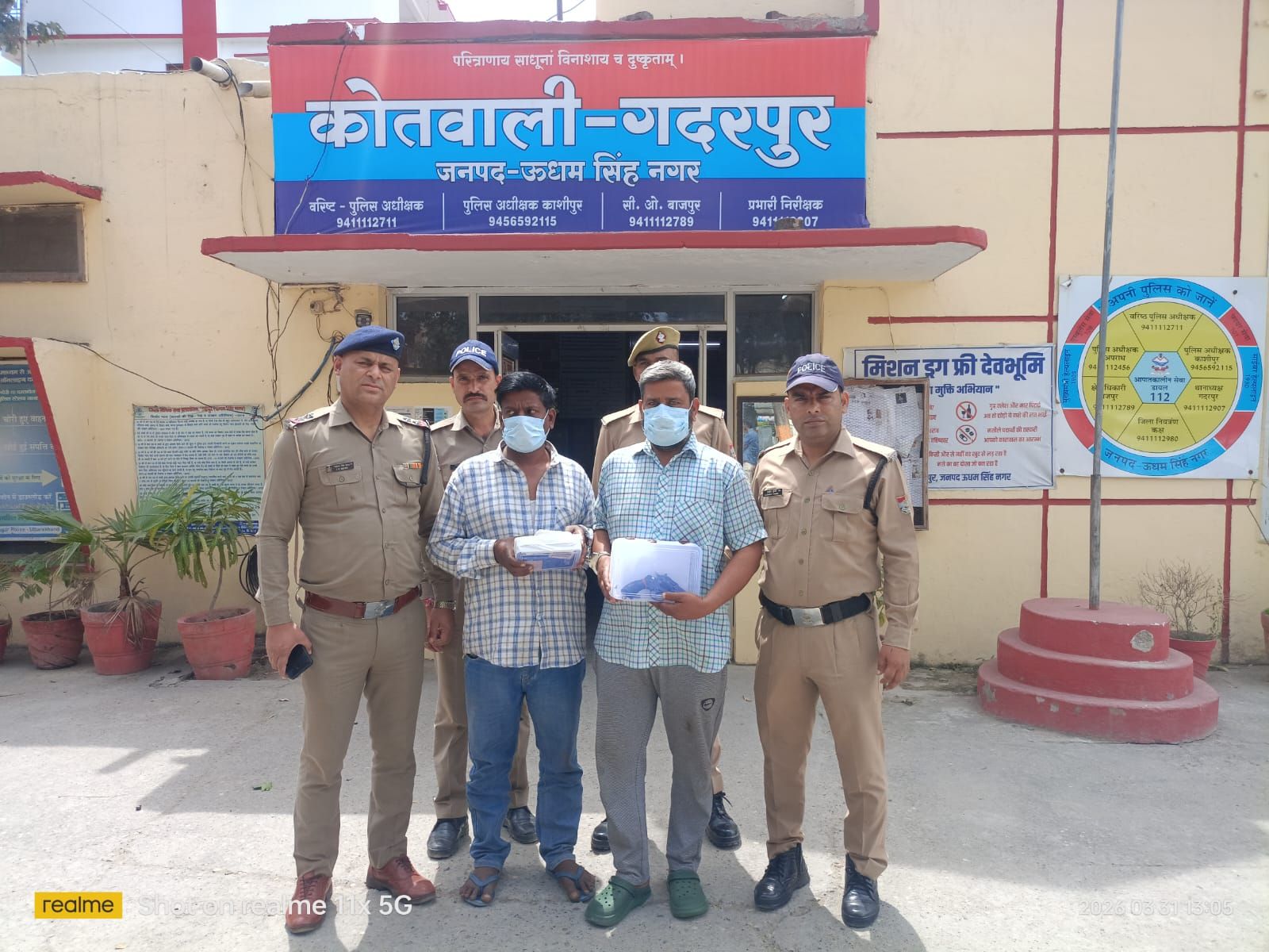 पुलिस ने सकैनिया क्षेत्र स्थित कुईखेड़ी तिराहे के पास से अभियुक्त सर्वजीत सिंह (45 वर्ष) एवं रविशंकर उर्फ गुड्डू (46 वर्ष) को गिरफ्तार कर लिया, जबकि एक विधि विवादित किशोर को संरक्षण में लिया गया।