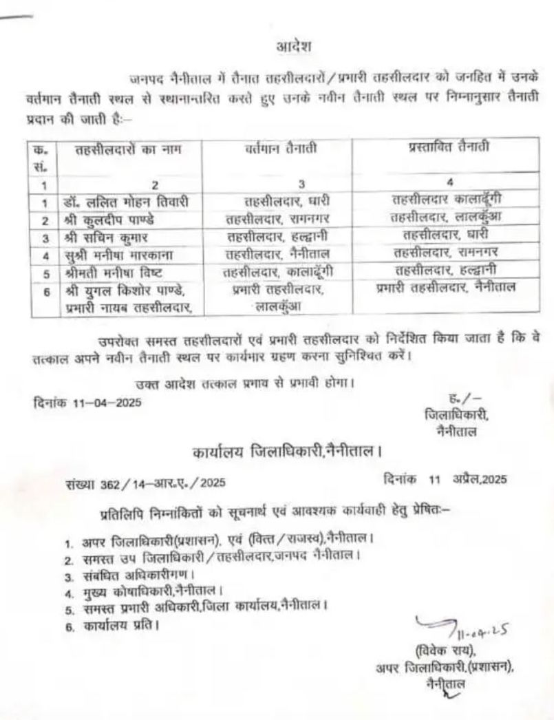 नैनीताल( संवाद सूत्र) नैनीताल जिला प्रशासन ने नैनीताल जिले के कई तहसीलदारों के तबादले कर दिए वहीं अब हल्द्वानी की तहसीलदार अब मनीषा बिष्ट को बनाया गया है वही सचिन कुमार को धारी तहसीलदार बनाया गया
