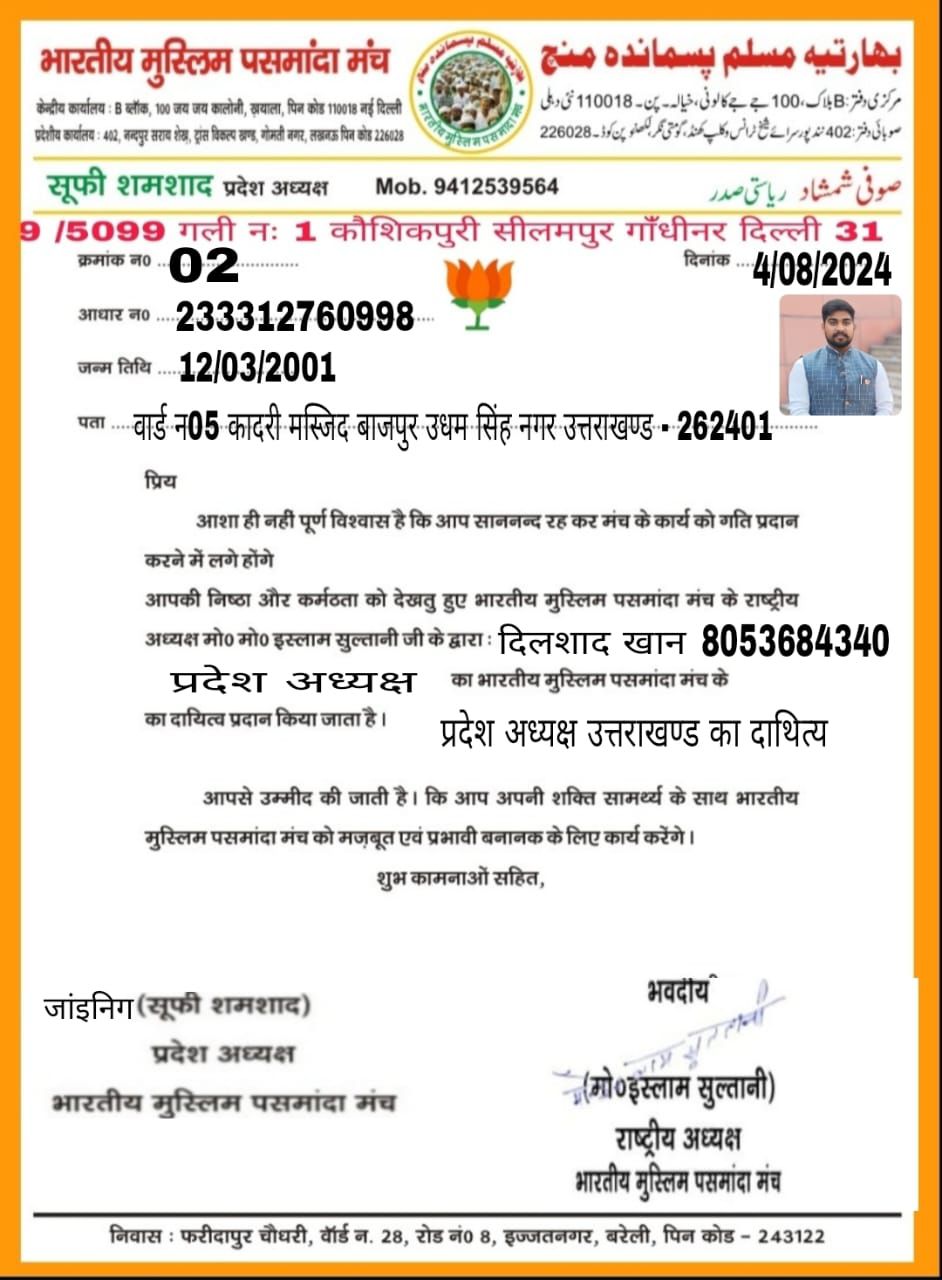 भारतीय मुस्लिम पसमांदा मंच के राष्ट्रीय अध्यक्ष मो0 इस्लाम सुल्तानी ने दिलशाद खान को प्रदेश अध्यक्ष का दायित्व सौपा। इस्लाम सुल्तानी ने दिलशाद खान से संगठन के प्रति निष्ठा के साथ अपने दायित्य का निर्वाह करने की अपील करते हुए संगठन को मजबूत बनाने के लिए अधिक से अधिक लोगों को जोड़ने का अनुरोध किया।