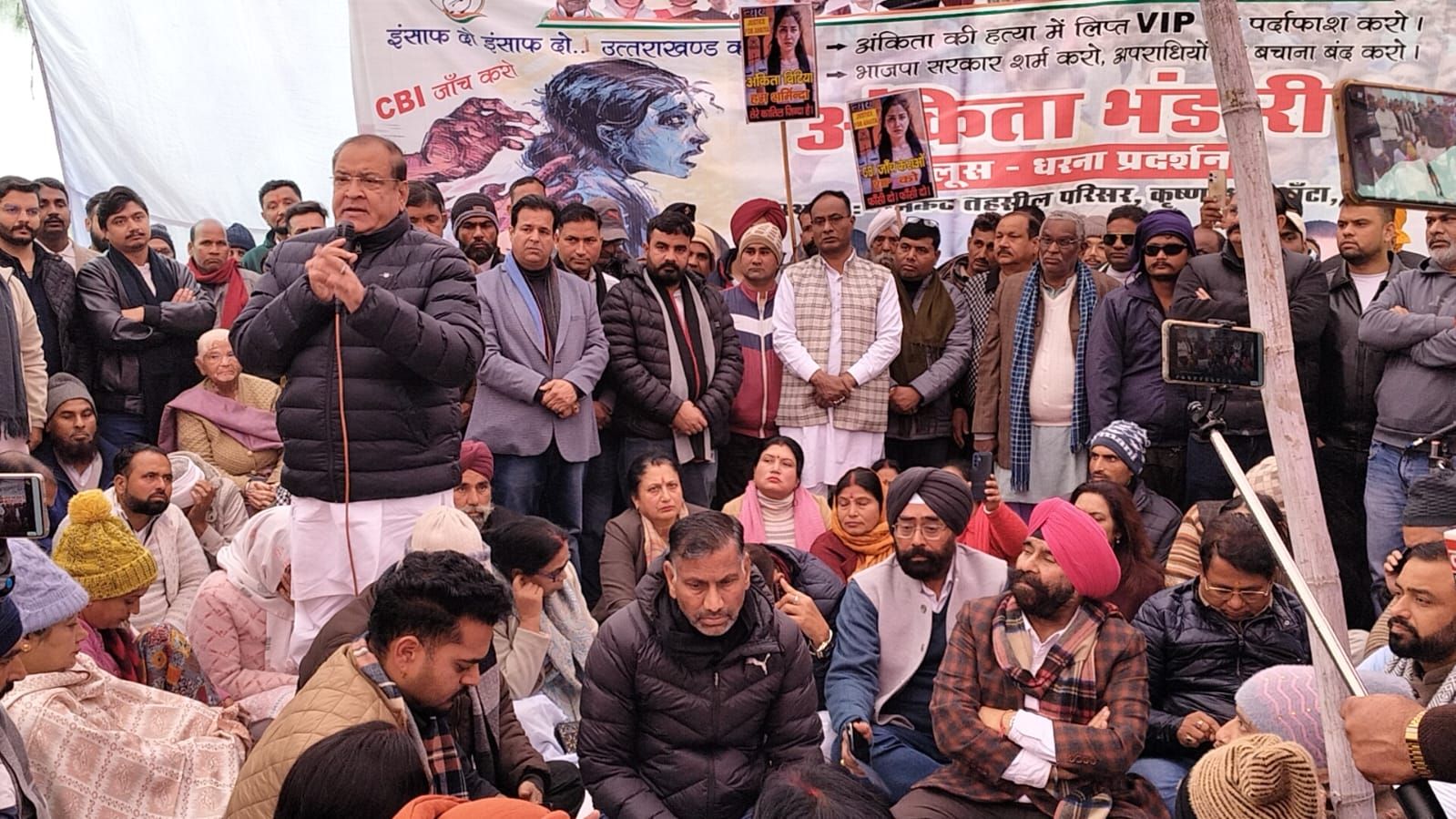वहीं वरिष्ठ कांग्रेस नेता राजेंद्र पाल सिंह ने कहा कि प्रदेश सरकार द्वारा अंकिता भंडारी के अलावा अन्य मातृशक्ति पर भी जुल्म किए गए हैं । जिन्हें आज तक न्याय नहीं मिला । जनसभा को श्री नानकमत्ता विधायक गोपाल सिंह राणा, जसपुर विधायक आदेश सिंह चौहान, किसान कांग्रेस नेता हरेंद्र सिंह लाडी, कांग्रेस जिलाध्यक्ष हिमांशु गाबा, ममता हालदार,पूर्व पालिकाध्यक्ष अनिल सिंह, रुद्रपुर की पूर्व पालिकाध्यक्ष मीना शर्मा, दीपिका गुड़िया, पूर्व कांग्रेस जिलाध्यक्ष नारायण सिंह बिष्ट, मनोज देवराड़ी, सत्यजीत सिंह गुलाटी, गणेश उपाध्याय,यशोदा जोशी,सहित तमाम वक्ताओं ने संबोधित किया । इस मौके पर भारी संख्या में दिनेशपुर, गूलरभोज आदि ग्रामीण क्षेत्र से मातृशक्ति ने प्रतिभाग किया, जो कि अंकिता भंडारी के हत्यारों को फांसी दो, सजा दो, के स्लोगन लिखी तख्तियां व बैनर लेकर प्रदर्शन करते हुए पहुंची। इस दौरान इंद्रपाल सिंह संधू, गुरविंदर विर्क, शैलेंद्र शर्मा, हरभजन सिंह, विजय प्रधान, एडवोकेट आरपी सिंह, विजय कुमार, गगनदीप सिंह, संजीव अरोड़ा, मनोज देवराडी, मोहन जी, काशीपुर महानगर अध्यक्ष पूजा सिंह,गौरव डंग,चंद्रा जोशी राजू डुमरा, भूपेंद्र कौर बेदी, फुरकान अहमद, अहमद अली तिवारी राजेश बाबा, अमरजीत सिंह, विश्वनाथ शाहू, सतनाम सिंह, सरताज अहमद सहित सैकड़ो कांग्रेस कार्यकर्ता शामिल रहे। वही आखिर में कुंवर सिंह गंगवार रुद्रपुर निवासी ने अंकित भंडारी के केस में सीबीआई जांच न करने के कारण तहसील गदरपुर में अपने सर का मुंडन करवाया