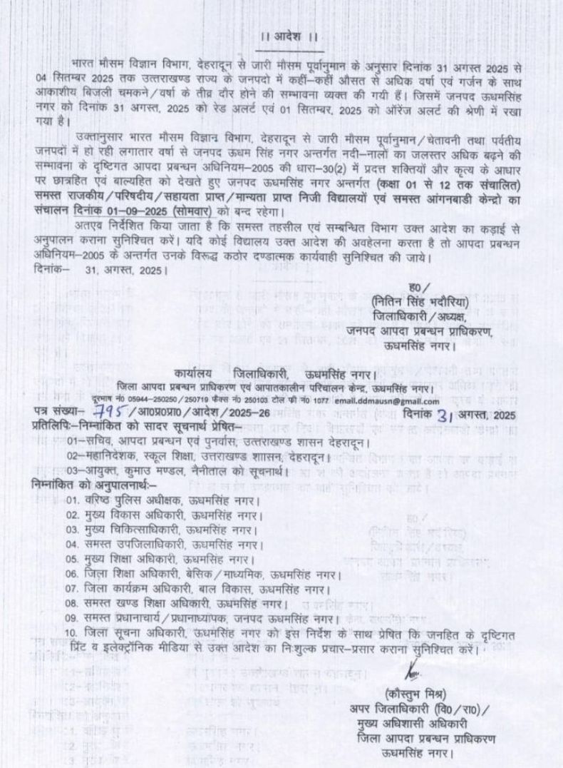 रुद्रपुर। उत्तराखंड में मौसम का मिजाज लगातार बिगड़ता जा रहा है। भारत मौसम विज्ञान विभाग, देहरादून द्वारा जारी अलर्ट के अनुसार 1 सितंबर को राज्य के कई हिस्सों में भारी बारिश (ऑरेंज अलर्ट) एवं तेज गर्जना जताई गई है। इसे देखते हुए ऊधम सिंह नगर डीएम नितिन सिंह भदौरिया द्वारा 1