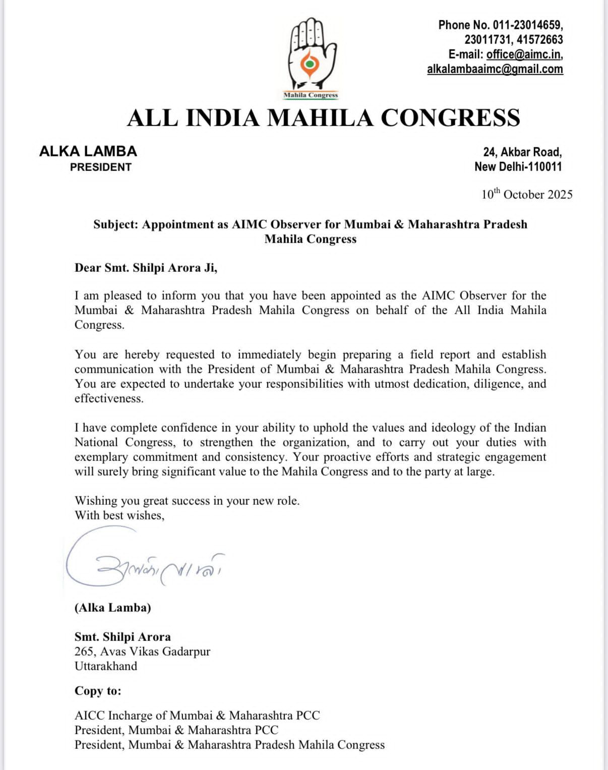 गदरपुर( संवाद सूत्र) अखिल भारतीय महिला कांग्रेस ने शिल्पी अरोरा को मुंबई एवं महाराष्ट्र प्रदेश महिला कांग्रेस के लिए अखिल भारतीय महिला कांग्रेस (AIMC) पर्यवेक्षक नियुक्त किया है। इस नियुक्ति के साथ ही, शिल्पी अरोरा को संगठन को मजबूत करने और पार्टी की विचारधारा को बढ़ावा देने की जिम्मेदारी सौंपी गई है। शिल्पी अरोरा को तुरंत एक फील्ड रिपोर्ट तैयार करने और मुंबई एवं महाराष्ट्र प्रदेश महिला कांग्रेस की अध्यक्ष से संपर्क स्थापित करने का निर्देश दिया गया है। उनसे अपेक्षा की जाती है कि वे अपनी जिम्मेदारियों को पूर्ण समर्पण, परिश्रम और प्रभावशीलता के साथ निभाएंगी। ।अलका लांबा ने कहा कि शिल्पी अरोरा को अपनी जिम्मेदारियों का निर्वहन करने के लिए पूरी स्वतंत्रता होगी और उन्हें हर संभव सहयोग प्रदान किया जाएगा। अखिल भारतीय महिला कांग्रेस की राष्ट्रीय अध्यक्ष अलका लांबा ने शिल्पी अरोरा की नियुक्ति पर विश्वास व्यक्त किया है कि वे अपनी जिम्मेदारियों को पूर्ण निष्ठा और समर्पण के साथ निभाएंगी। उन्होंने कहा कि भारतीय राष्ट्रीय कांग्रेस के मूल्यों और विचारधारा को बनाए रखने, संगठन को मजबूत करने और अनुकरणीय प्रतिबद्धता एवं निरंतरता के साथ अपने कर्तव्यों का निर्वहन करने की शिल्पी अरोरा की क्षमता पर पूरा विश्वास है। इस नियुक्ति के साथ ही, महिला कांग्रेस को एक मजबूत और अनुभवी नेतृत्व मिलने की उम्मीद है। शिल्पी अरोरा की सक्रियता और रणनीतिक भागीदारी निश्चित रूप से महिला कांग्रेस और समग्र पार्टी के लिए महत्वपूर्ण योगदान देगी। हमें विश्वास है कि शिल्पी अरोरा अपनी नई जिम्मेदारी को सफलतापूर्वक निभाएंगी और पार्टी की विचारधारा को बढ़ावा देने में महत्वपूर्ण भूमिका निभाएंगी।