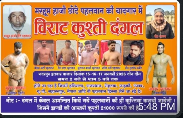 गदरपुर ( न्यूज़ )मरहूम हाजी छोटे पहलवान की यादगार में गदरपुर के इतवार बाजार में तीन दिवसीय विराट कुश्ती दंगल का भव्य आयोजन किया जा रहा है। यह दंगल 15, 16 व 17 जनवरी 2026 को प्रतिदिन दोपहर 2 बजे से शाम 5 बजे तक आयोजित होगा।