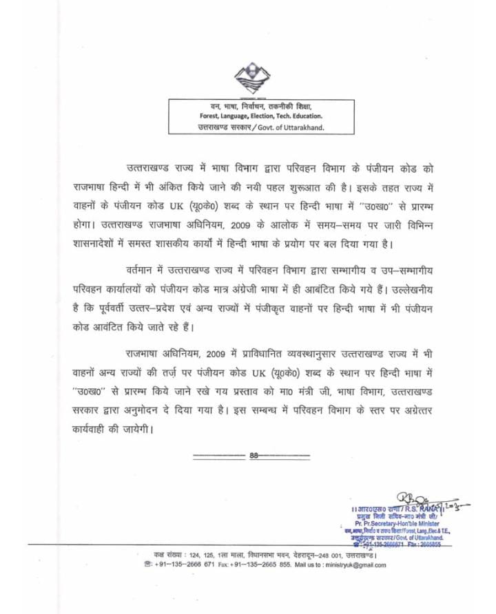 Vयह निर्णय उत्तराखंड राजभाषा अधिनियम, 2009 के तहत लिया गया है, जिसमें सरकारी कार्यों में हिंदी भाषा के प्रयोग को अनिवार्य किया गया है। अधिनियम के अनुरूप समय-समय पर जारी शासनादेशों में स्पष्ट रूप से निर्देशित किया गया है कि प्रशासनिक कार्यों में हिंदी को प्राथमिकता दी जाए। इस निर्णय को लेकर भाषा विभाग का कहना है कि इससे न केवल राजभाषा को बल मिलेगा, बल्कि राज्य की सांस्कृतिक पहचान भी और सशक्त होगी। साथ ही वाहन पंजीयन की प्रक्रिया में भी स्थानीयता का भाव जुड़ सकेगा। राज्य सरकार के इस फैसले के लागू होते ही जल्द ही उत्तराखंड के सड़कों पर ‘उ०ख०’ कोड वाले वाहन दौड़ते दिखाई देंगे, जो न केवल प्रशासनिक निर्णय का हिस्सा होंगे बल्कि राजभाषा सम्मान की एक प्रतीकात्मक झलक भी होंगे।